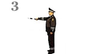 При третьем сигнале правая рука регулировщика вытянута вперед.
